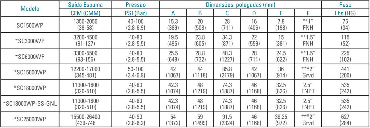 Unidades: Operam com pressões de soluções de espuma de até 40 psi